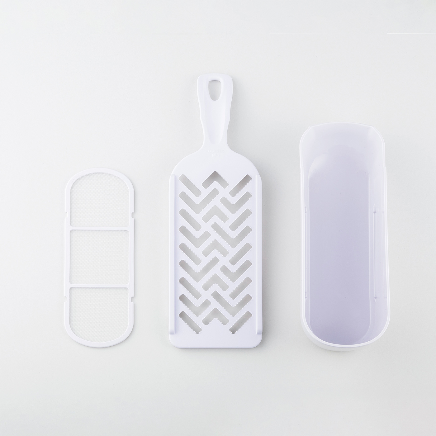 おろし器・受け皿・目皿枠:ABS樹脂(耐熱温度100℃) 目皿網:ナイロン(耐熱温度140℃) すべり止め足:ポリウレタン(耐熱温度120℃) ※耐熱温度内でも、急激な温度変化は加えないでください。また食洗機内のヒーター部分付近には置かないでください。歪みの原因となります。