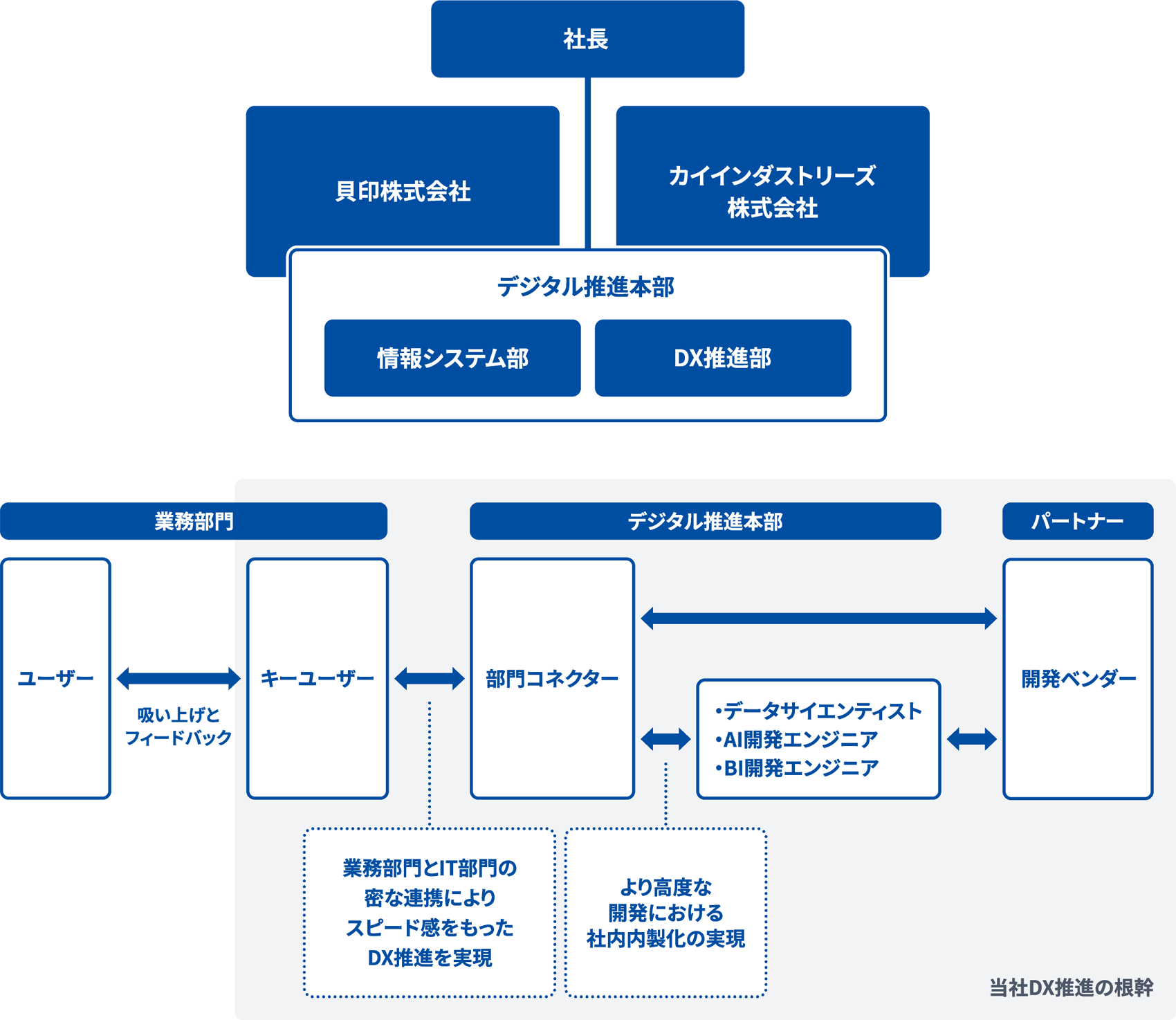 DX戦略の推進にあたって、業務部門サイドにもDX推進を担うメンバーを置き、デジタル推進本部メンバーとの関係性を強化し、DX推進のスピードを高めていきます。