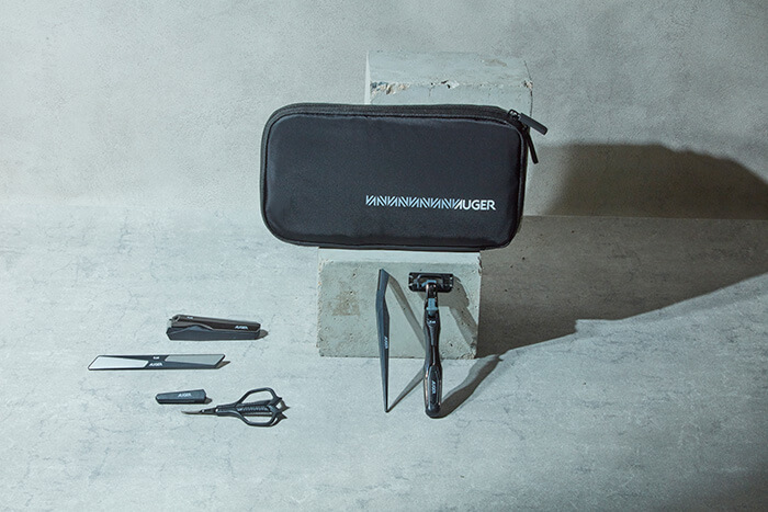 斎藤佑樹さんがAUGERブランドからおすすめアイテムとしてセレクトしたシステムカミソリ、ツメキリ M Standard、ネイルファイル、オシャレハサミ、アイブローシェイピングレザーとポーチをセットにしました。