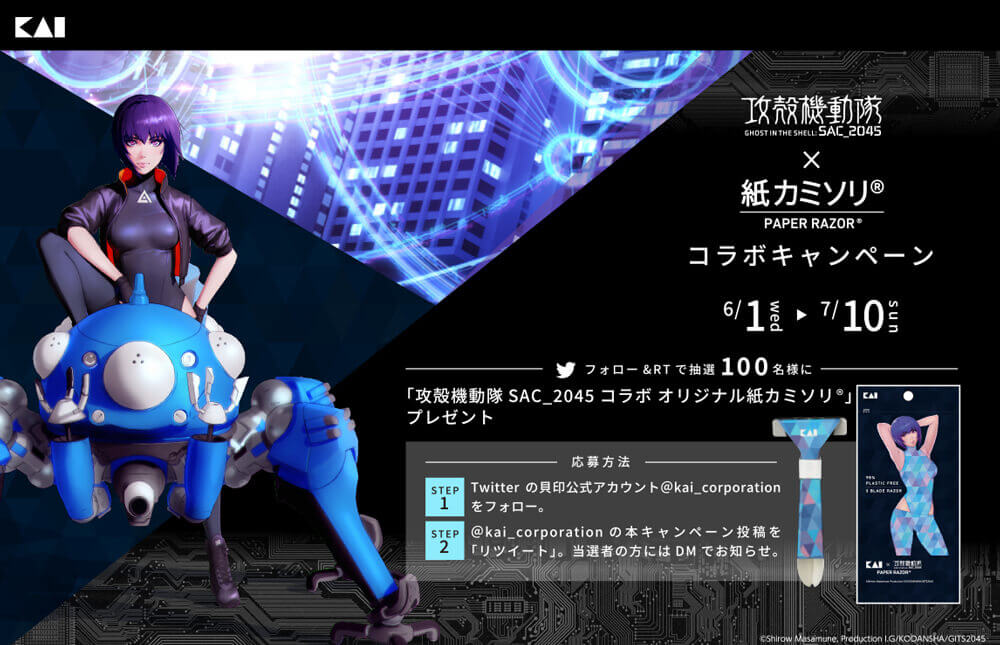 グローバル刃物メーカーの貝印株式会社(本社:東京都千代田区、代表取締役社長兼COO:遠藤浩彰)は、ローソンでの「紙カミソリ®」販売と、Netflixオリジナルアニメシリーズ『攻殻機動隊SAC_2045』SEASON2の放映を記念し、『攻殻機動隊SAC_2045』とコラボレーションした「紙カミソリ®︎」を製作しました。2022年6月1日(水)より、今回のプレゼントキャンペーンでしか手に入らない限定デザインのコラボレーション「紙カミソリ®」が、Twitterの対象投稿をフォロー・リツイートで抽選100名様に当たるキャンペーンを実施します。