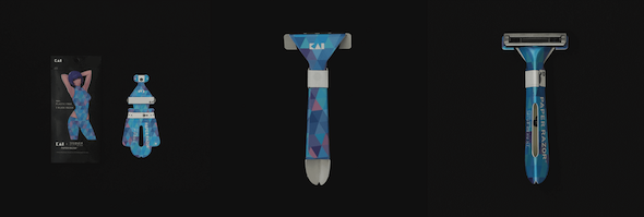 貝印のコーポレートカラーのブルーを基調に3つの頂点をグラフィカルでソリッドなトライアングルで表現されています。また、ランダムに散りばめ洗練されたパターンにしたコスチュームは、クールでスタイリッシュな草薙素子の近未来の迷彩柄をイメージし、「紙カミソリ®」本体のデザインとして活用しています。