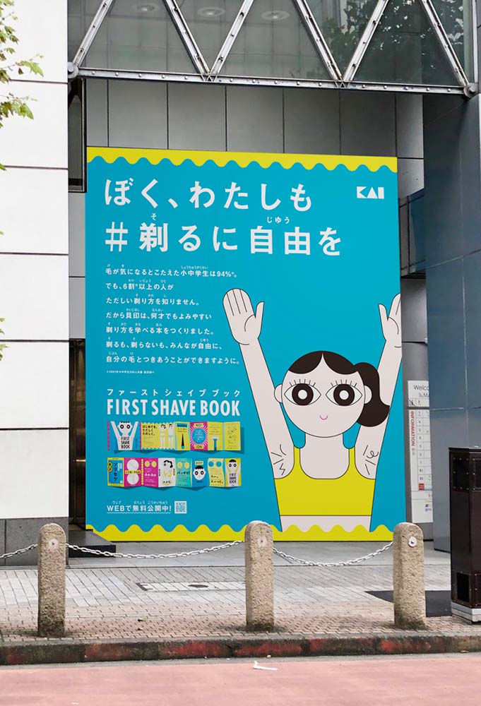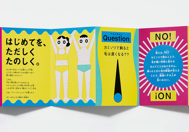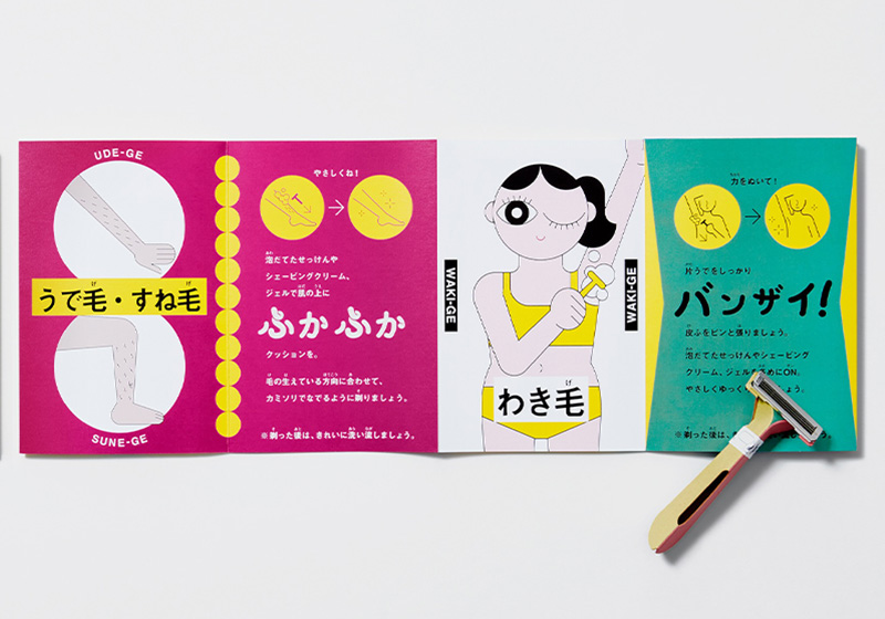 FIRST SHAVE BOOK™は、はじめてカミソリを使う人へ向けた剃り方説明書と今回のためにオリジナルデザインで開発した紙カミソリ®が付属された本。毛の剃り方だけではなく、「剃ると毛が濃くなる」「肌にブツブツができてしまう」などの間違った知識による毛の心配が少しでもなくなるように、武庫川女子大学薬学部教授の平尾哲二先生に監修いただき、わかりやすく解説しています。イラストレーターの瓜生太郎さんがイラストを制作し、剃り方や毛の知識を楽しく学べる、見やすくポップな本に仕上げました。