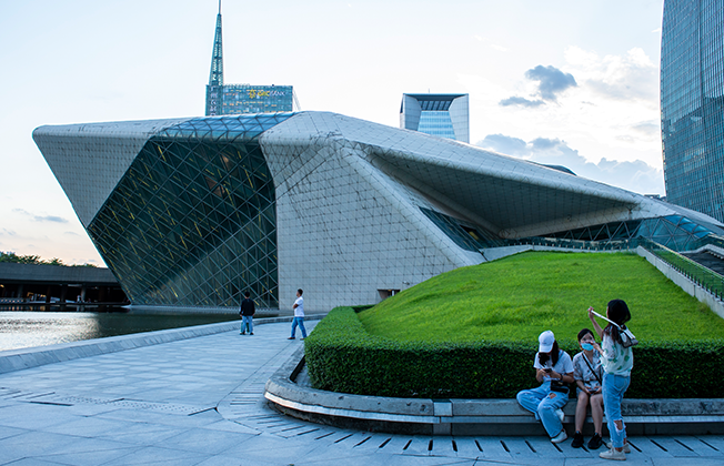 2010年に完成した、世界的に有名な建築家、ザハ・ハディドによる〈広州大劇院(オペラハウス)〉。周辺は市民の憇いの場となっている。