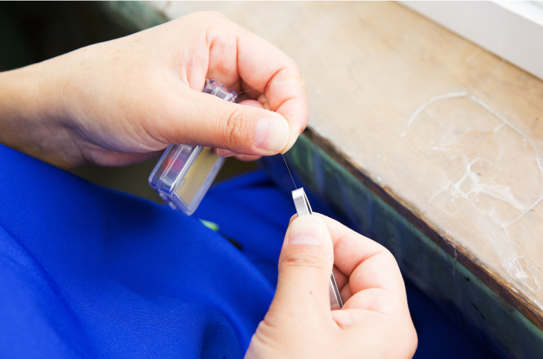 1本1本の毛をしっかりとらえて、無理なく抜くことができるようにするため、先端部分を磨いてきます。