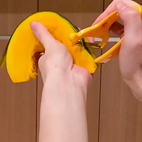 カボチャの硬くて剥きづらい皮も快適調理。食材を挟むだけでらくらく剥けちゃうカボチャピーラーです。