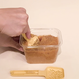 「すくう」「計る」「こす」の3役を1つでできる優れもの味噌こしのご紹介です。味噌の容器の隅まですくいやすいスプーン形状、スプーン1杯で大さじ1=味噌汁1人前(スプーン2つ分で大さじ2=味噌汁2人前)、あとはスプーンを閉じてそのままお鍋で味噌をこせちゃいます。計量スプーン、お玉や菜箸、味噌こしを使わないから、面倒臭い洗い物も少なく済みますよ。