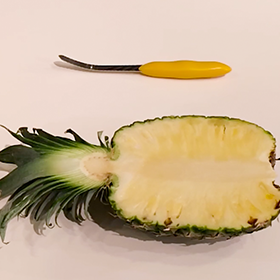 パイナップルの実を皮からきれいに切り取れるナイフのご紹介です。刃が皮に沿うカーブ状になっており、包丁では難しい作業もらくらく。切り取ったパイナップルの皮は器にして、トロピカル炒飯やフルーツ盛り合わせなど、華やかなパーティーメニューにもご活用いただけます。パイナップル以外にも、グレープフルーツなどの果物にもご使用できます。