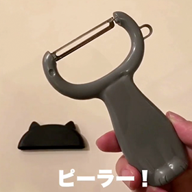 当社売れ筋商品の性能を活かしつつ、キッチンの雰囲気を邪魔しない形でネコモチーフを取り入れました。ネコ好きの方もそうでない方も『欲しい!使いたい!』と思える、ほどよいネコ感を大切にした、ピーラーのご紹介です。便利な芽取りはもちろん、裏側は薬味おろしに使えます(おろし金の形もネコなんです!)ネコ耳のぼうし型カバー付きで、収納時の安全性を高めています。