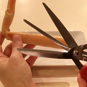 身くずれせず、きれいにカットできる3枚刃ハサミの使い方をご紹介します。わずらわしいカニの殻剥き作業もこれにて一件落着!楽しい食卓の必需品として、お買い求めください。