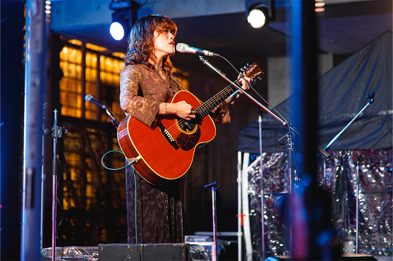 最初に登場したのは、優河さん。アコースティックギターを抱えて登場し、リリース前の「All the words you said」、そして18歳の時に初めて書いた楽曲「愛を」を皮切りに弾き語りでのパフォーマンスが始まりました。深くのびやかな歌声とギターの豊かな音色が、車が行き交う音やクラクション、街の喧騒と自然に溶け合い、辺り一帯に心地よく響き渡りました。その後も、2019年リリースの「めぐる」、ベッド・ミドラーの「The Rose」のカバー、そして亡き祖母への思いを込め、自分の中では最大のラブソングだという「灯火」の、全6曲を披露した優河さん。会場中がその静かな優しさに包み込まれた、美しい30分間となりました。