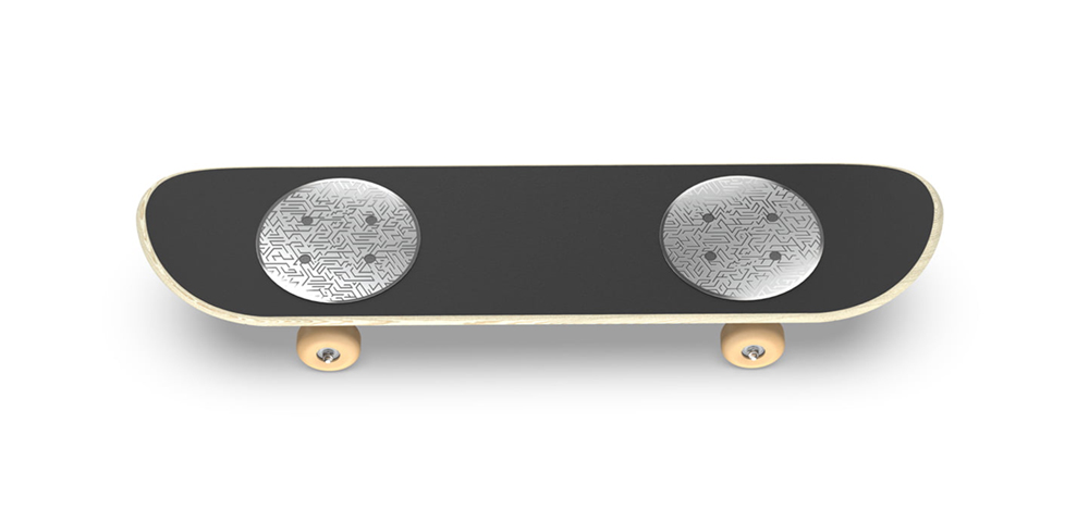 - ステンレスプレートをエッチング加工し、表面を荒らすことで得られる「ヤスリ効果」をスケートボードのデッキテープの一部として機能拡張するためのデザインです。