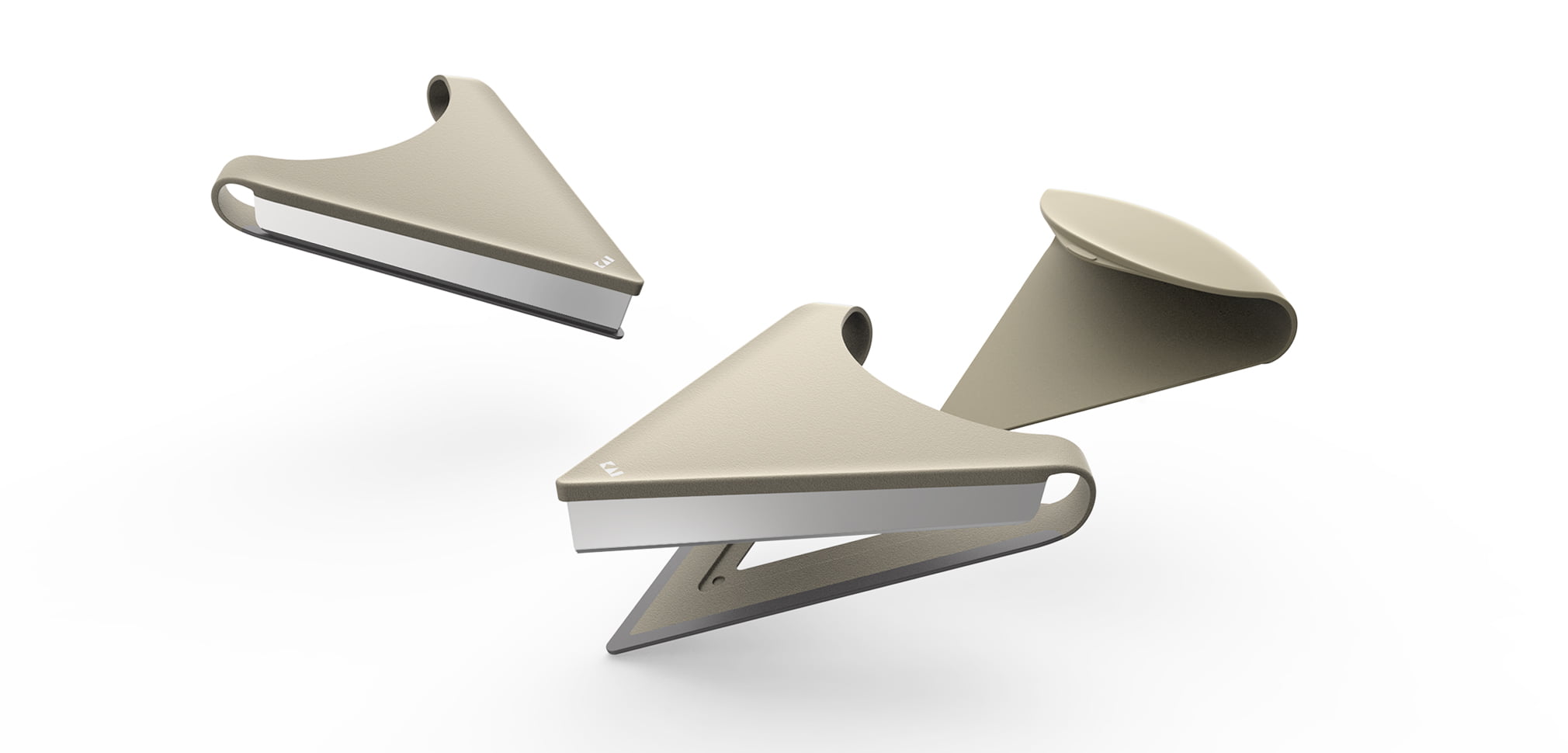 角度をつけた2枚の刃を搭載したピザカッター。本体をピザに差し込み、上面を押し込むことでピザを一度に三角カットできます。後部は本体から取り外すことでピザの持ち手として機能し、ピザが垂れ下がることなく、また手も汚すことなくピザを楽しめます。